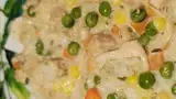 A delightful, savory dish combining tender chicken and veggies in a rich sauce, enclosed in a flaky crust.